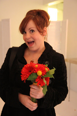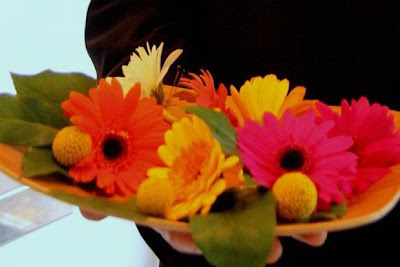 I knew this wedding would be incredibly inventive and edgy. Both Wayne and Laura are wonderfully creative people, so I had high hopes. I'm pleased to say my expectations were exceeded! The bride wanted to use all daisies -- daisies daisies daisies of every type and color -- and I was all too happy to oblige! Each of her three bridesmaids received a different bouquet of color-coordinated blooms.