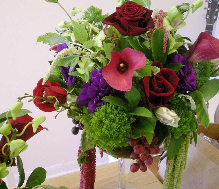 And this year, the event got a little extra fabulous, with flowers provided by Forget Me Knodt. :) And when the challenge is a wine tasting, how could one resist working with grapes? My first stop, then, was at the grocery store, where I purchased grapes in every variety and color!