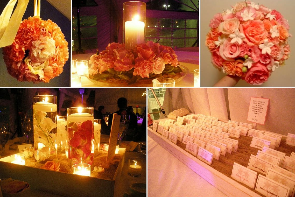 A lot of sand, boat-loads of soft flowers in bright shades of pink, and tons of candlelight combined to successfully create the look of "beachside elegance" the couple wanted to achieve. Here's a sneak preview - just some candid shots of the centerpieces and bouquets. Professional shots to come in due time!
