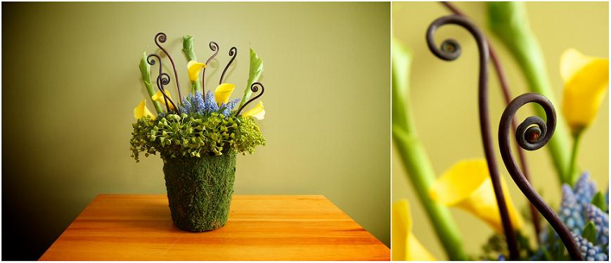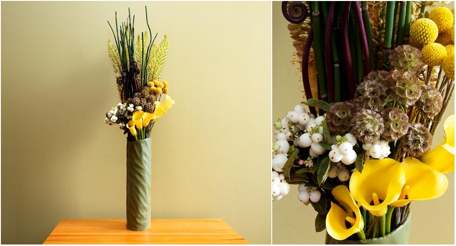 I wanted to find flowers that were beautiful, yet reminded me of bugs. Snowberry made me think of bug's eyes (!!!), Scabiosa Pods conjured images of honeycombs, while Billy Balls (aka Craspedia), Fiddlehead Ferns, Mini Callas and Rush Reeds completed the architectural look. I finished it off with a vase that reminded me of Mudswallows' nests. This one was so much fun!